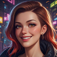 The image depicts a young woman with a joyful expression. She has red hair and fair skin. Her eyes are yellow, which may be due to lighting or digital manipulation for artistic effect. She is wearing makeup that includes prominent eyelashes and lipstick. The background suggests an urban setting with neon lights that could imply a futuristic or nighttime atmosphere.
