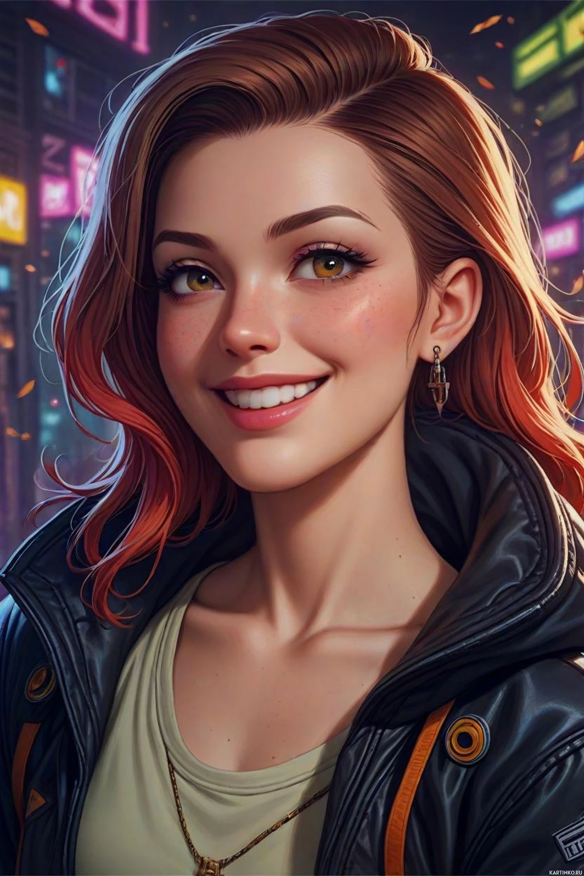 На картинке запечатлена молодая женщина с радостным выражением лица. У нее рыжие волосы и светлая кожа. Ее глаза кажутся желтыми, возможно, из-за освещения или цифровой обработки для художественного эффекта. На ней макияж с акцентом на ресницы и яркая помада. Фон указывает на городскую обстановку с неоновыми огнями, создающими футуристическую или ночную атмосферу.