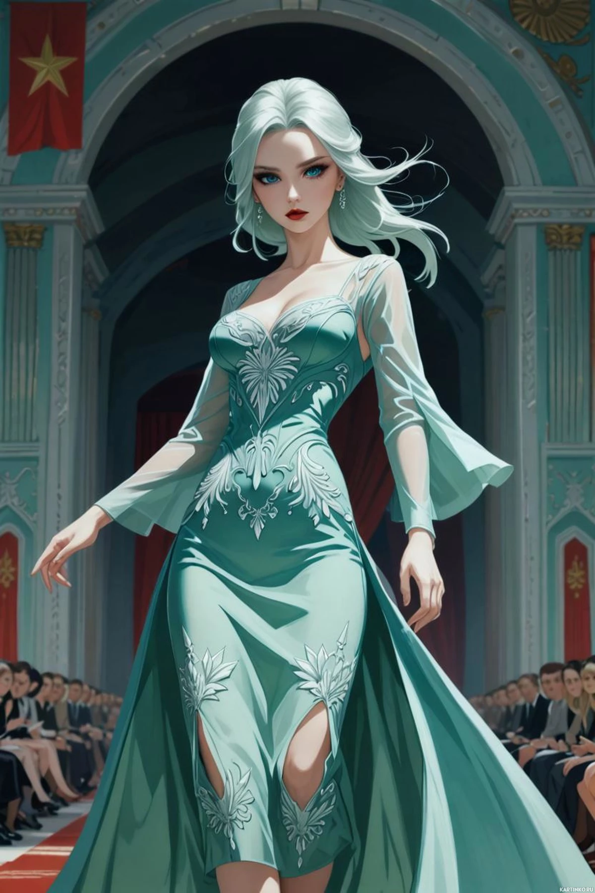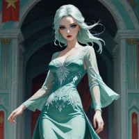 На картинке женщина стоит в центре величественного помещения, похожего на собор или богато украшенный зал. У нее бледная кожа и серебряные волосы. Она одета в длинное синее платье с замысловатым узором. Ее осанка прямая, и она, кажется, смотрит прямо перед собой. Вокруг нее люди сидят, но они отходят на второй план и не являются главным фокусом этой картинки. В помещении высокие окна, через которые проникает естественный свет, подчеркивая архитектурные детали и общее величие обстановки.