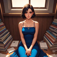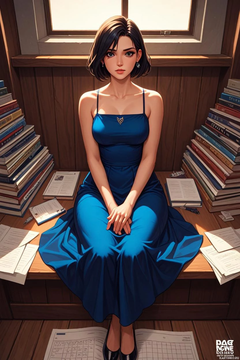 In this image, a woman with short brown hair is seated in front of a window. She is wearing a long blue dress and black shoes. Next to her is a stack of books that are not neatly arranged. The room has wooden paneling on the walls.