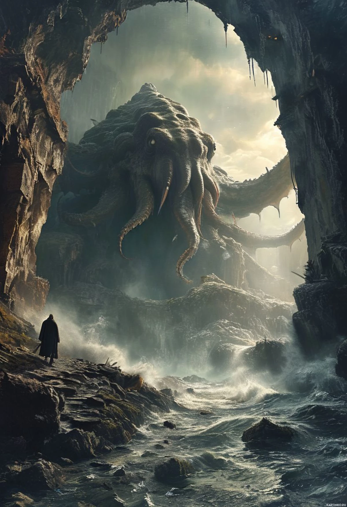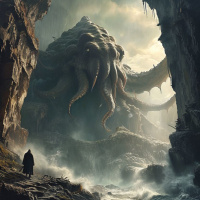 a fantastical scene unfolds where a massive creature resembling Cthulhu is depicted. The monster has tentacles and an elongated head, characteristic of