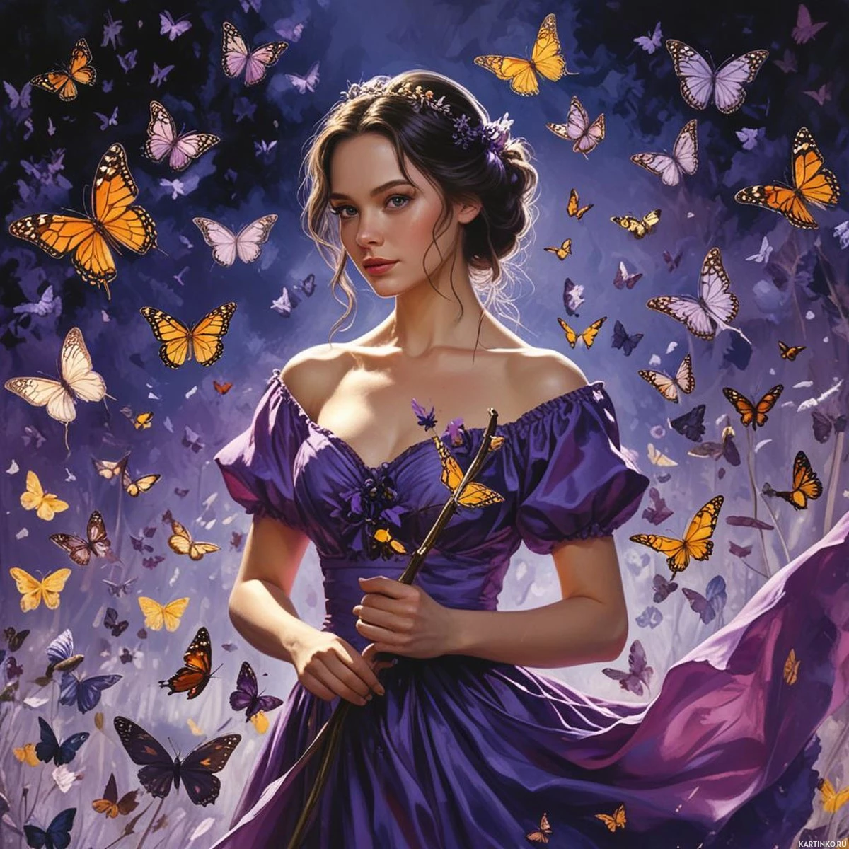 На картинке изображена брюнетка в фантастическом пейзаже. На ней фиолетовое платье с пышными рукавами и воротником с оборками. Волосы уложены в легкие волны, обрамляющие плечи. Фон – нежная смесь темно-синего и фиолетового, напоминающая ночное небо или густой лес. По всей картинке разлетаются бабочки различных оттенков фиолетового и желтого, создавая волшебную атмосферу. Девушка стоит, одна рука грациозно держит посох, а другая нежно касается распускающегося цветка на платье.