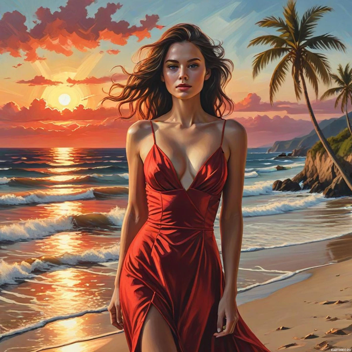 На картинке запечатлена женщина на пляже на закате. У неё длинные каштановые волосы, и она одета в красное платье, которое развевается, когда она идёт по берегу. На заднем плане видны пальмы, что указывает на тропическое местоположение, а небо окрашено в яркие оттенки оранжевого, розового и голубого – характерные для времени заката. Общая сцена передаёт ощущение спокойствия и красоты, свойственное прибрежным пейзажам в золотой час.