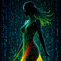 The image depicts a digitally created figure of a person. This figure is predominantly human in form but with various artistic embellishments that give it an otherworldly or fantastical appearance. The figure's head and torso are visible, with the former having detailed facial features and the latter being a solid color that could be interpreted as a metallic sheen. The most striking feature of this figure is its lower body, which has been artistically designed to resemble a tree or a plant, complete with roots and branches extending from the legs. The tree-like form is vibrant and multicolored, with red, blue, yellow, green, and orange hues that create an organic contrast to the figure's otherwise inanimate appearance. The background of the image consists of a darkened room with subtle lighting effects that highlight the figure, casting beams of light upward and creating a moody atmosphere. The floor has a grid pattern that adds to the sci-fi or futuristic feel of the scene. There is also what appears to be rainbow-colored liquid or gel dripping down from the figure's legs, which contributes to the otherworldly and surreal quality of the image. Overall, the style of the image leans towards digital art, with a focus on conceptual design and creative representation of the human form in an unusual context.