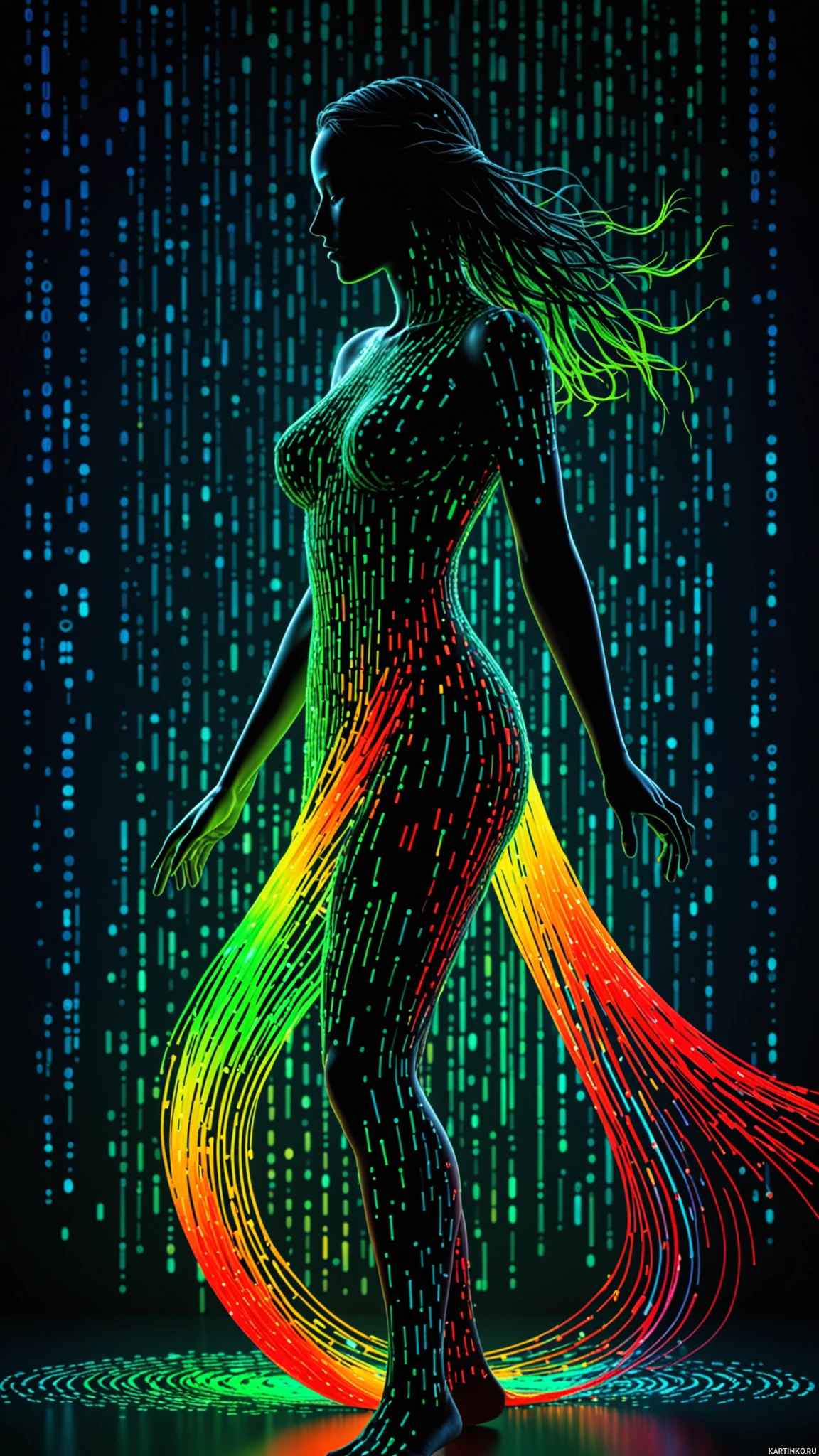 На картинке изображена цифровая иллюстрация человеческой фигуры. Она преимущественно антропоморфна, но украшена различными художественными элементами, придающими ей неземной или фантастический вид. Видны голова и торс, первая детализирована чертами лица, а вторая выполнена в однотонном цвете, напоминающем металлический блеск. Самая примечательная черта этой фигуры — ее нижняя часть тела, выполненная в виде дерева или растения с корнями и ветвями, отходящими от ног. Эта древовидная форма яркая, многоцветная, с оттенками красного, синего, желтого, зеленого и оранжевого, создающими органичный контраст с безжизненным видом фигуры. Фоном картинки служит затемненное помещение с мягким освещением, подчёркивающим фигуру и создающим лучи света, уходящие вверх, что добавляет атмосферу таинственности. Пол имеет сетчатый узор, усиливающий научно-фантастический или футуристический характер сцены. Также заметна жидкость или гель, похожая на радугу, стекающая с ног фигуры, что добавляет ей неземной и сюрреалистичный характер. В целом, стиль картинки тяготеет к цифровому искусству, с акцентом на концептуальный дизайн и творческое представление человеческой формы в необычном контексте.