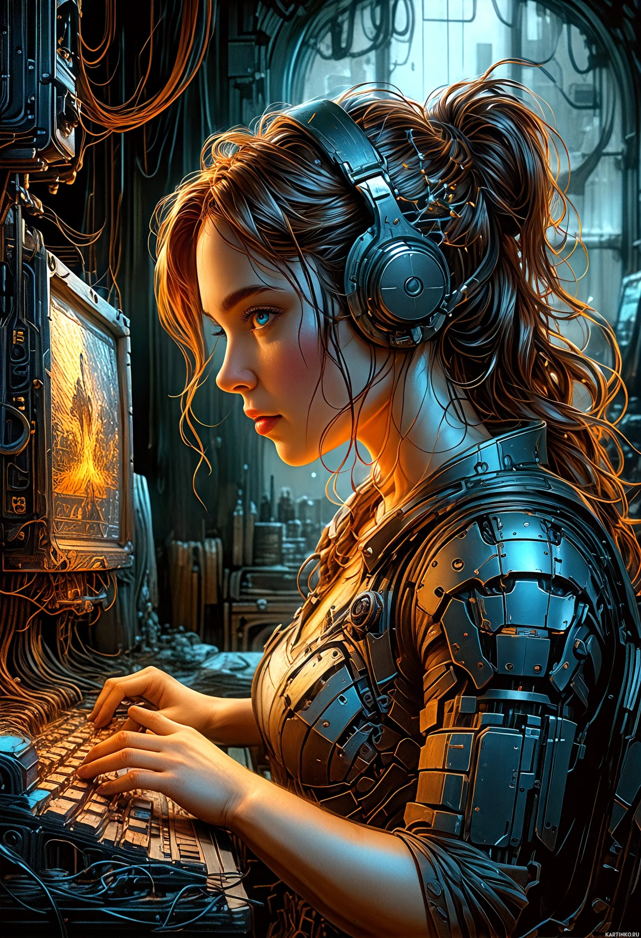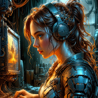 На картинке изображена молодая девушка в научно-фантастическом сеттинге. У нее длинные каштановые волосы, на ушах наушники, что наводит на мысль о прослушивании музыки или общении. На ней облегающий бронированный комбинезон, преимущественно черного и серебряного цветов, что создает впечатление передовых технологий или робототехники. Она сидит за компьютером, перед ней – экран, на котором отображается фантастический пейзаж, залитый оранжевым светом. Слева от нее – различное оборудование, включая электронные устройства и провода, усиливающие технологичную атмосферу сцены.