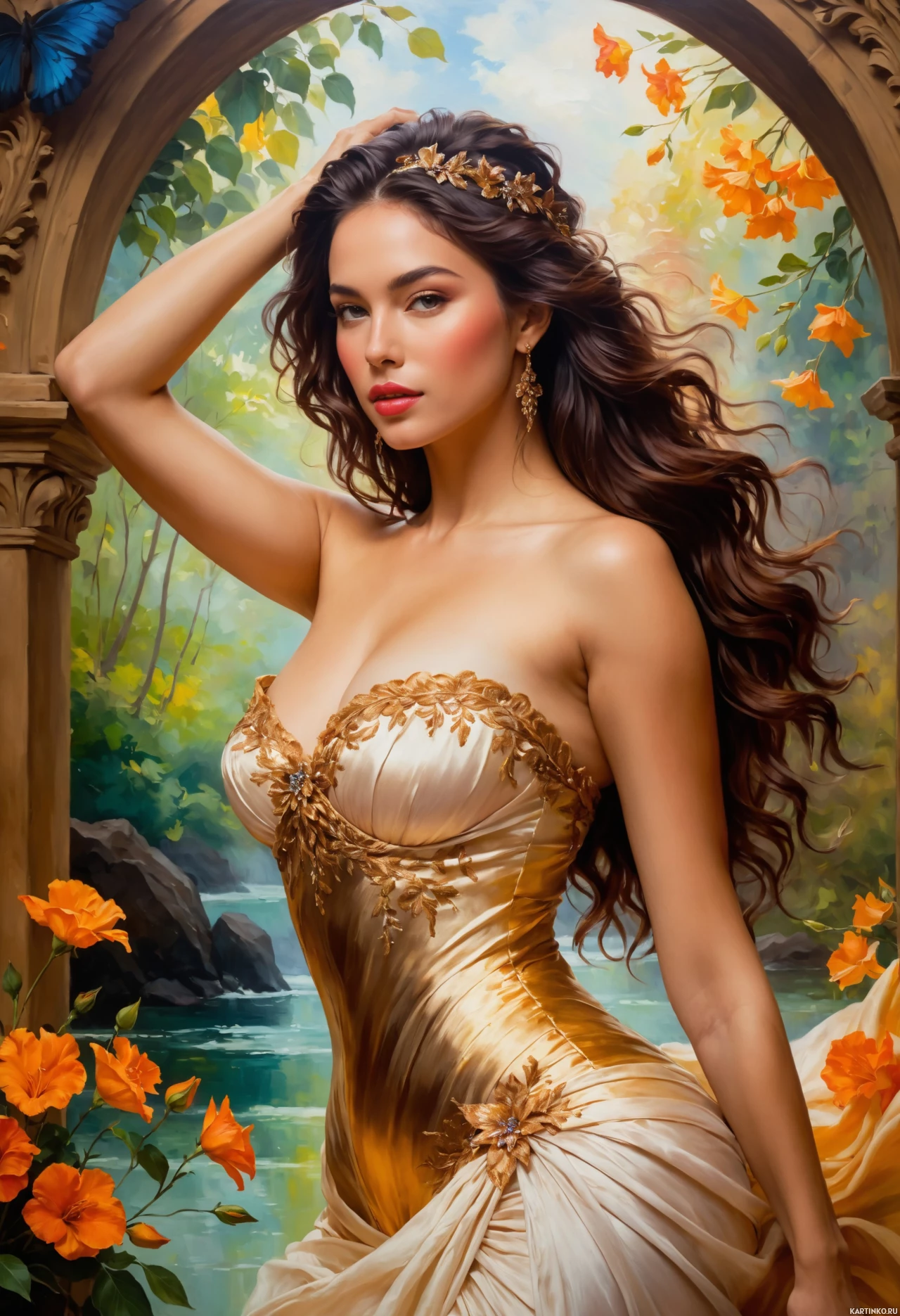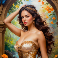 На картинке изображена женщина с длинными волнистыми каштановыми волосами и светлой кожей. У неё тёмные глаза, и она одета в золотые доспехи, которые подчеркивают её фигуру. Её поза словно застывшая в танце или в кульминационный момент драматического жеста: одна рука покоится на бёдрах, другая поддерживает голову. На заднем плане – пышная зелень с цветами, создающая ощущение сада или зачарованного леса.