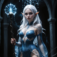 white hair. The character is dressed in a fantasy-themed outfit that includes a bodysuit and a cape. They are holding a staff topped with what appears to be an energy or magical element. The setting suggests a darker atmosphere, with a doorway and
