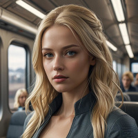 In the image, there is a young woman with blonde hair seated inside what appears to be a train car. She has fair skin and is wearing makeup that accentuates her eyes. Her expression is neutral with a hint of contemplation. She is dressed in a black bodysuit with zippers on the front and sleeves. The environment around her suggests an urban setting, likely a public transportation vehicle due to the visible train tracks outside the window.