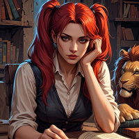 A young woman with vibrant red hair is seated at a desk. She is dressed in attire that resembles early 20th-century clothing, including what appears to be a waistcoat and trousers. Her attention seems divided between reading an open book before her and looking thoughtfully into the distance. To her right is a large, majestic lion statue with its head resting on the desk. The setting suggests a studious or scholarly atmosphere, possibly hinting at a theme of fantasy or historical fiction in the image.
