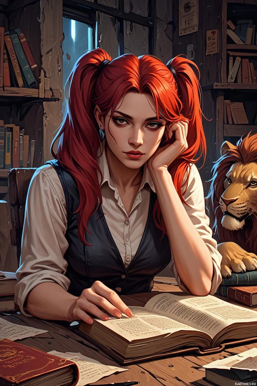 Молодая женщина с ярко-рыжими волосами сидит за столом. На ней одежда, напоминающая наряды начала двадцатого века, включая жилет и брюки. Её взгляд, кажется, рассеян между открытой книгой перед ней и задумчивым созерцанием вдаль. Справа от неё – большая, величественная статуя льва, склонившего голову на столе. Картинка создает впечатление ученой или научной атмосферы, возможно, намекая на тему фэнтези или исторического романа.