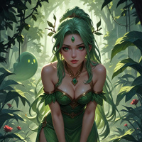 На картинке изображена молодая женщина с зелёными волосами, сидящая на мшистой земле в лесу. У неё сложены руки на груди, и она, кажется, смотрит вдаль или на что-то за кадром. На ней топ без рукавов с принтом, напоминающим листья, и юбка с похожим узором. Вокруг шеи – что-то вроде венка или ожерелья, украшенного мелкими цветами и листьями. На заднем плане возвышаются деревья с густой зеленью, некоторые из которых покрыты мелкими жёлтыми цветами. Справа от неё рядом с рукой кружится небольшое существо, похожее на стрекозу. Цветовая гамма картинки выдержана в разных оттенках зелёного, от светлых до тёмных, что указывает на природную среду.