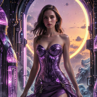 Картинка показывает женщину, стоящую в неземном пейзаже на закате. На ней струящееся платье без бретелек с лиловым корсетом и длинной юбкой, словно сотканной из того же материала. Волосы у нее зачесаны вверх. На заднем плане виднеется огромный арочный проход или портал, из которого льется свет, намекая на другой мир. В небе мерцают звезды, создавая атмосферу вечернего времени.