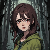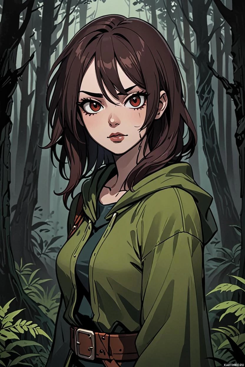 На картинке изображена девушка, вероятно, молодая, с короткой каштановой стрижкой и пронзительными голубыми глазами. У неё серьёзное выражение лица, и она смотрит прямо на зрителя. Кожа светлая, на щеках заметный румянец. На ней зелёная куртка с коричневыми кожаными вставками и поясом, что указывает на тематику фэнтези или приключений. Задний план – тёмный лес, окутанный туманом, создающий ощущение таинственности.