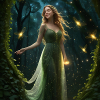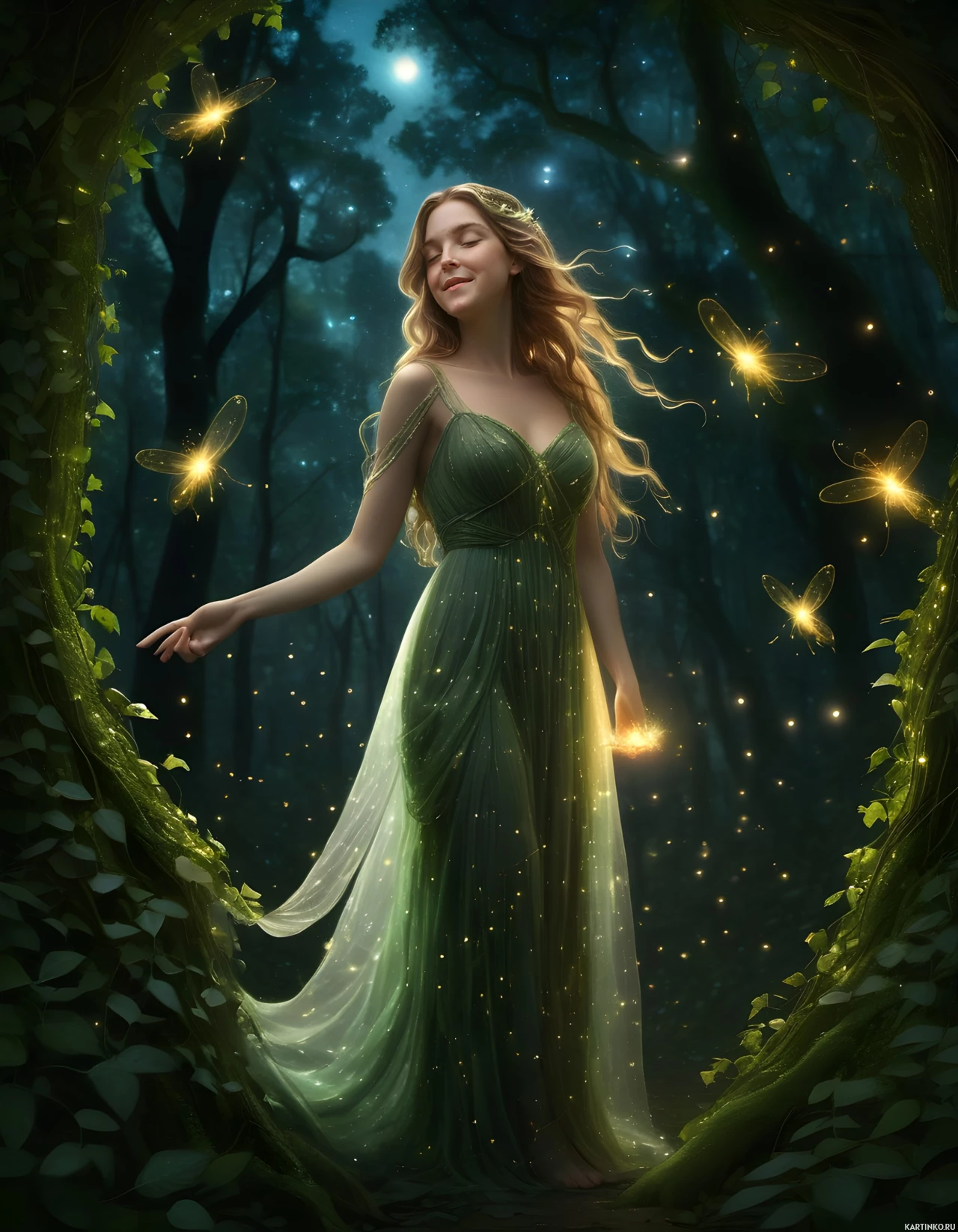 In the image, there is a female figure who appears to be blonde and wearing a dress that drapes elegantly around her. She is positioned within an arch formed by trees, suggesting a woodland or forest setting. The trees are adorned with lush greenery, adding to the natural beauty of the scene. It is nighttime, as indicated by the darkened background and the glowing eyes of the figure which could suggest she has closed her physical eyes while maintaining an open-eye expression. This gives a sense of mysticism or otherworldliness to the image. The overall atmosphere is one of serene beauty and possibly even magical realism.