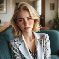 На картинке изображена женщина, сидящая на диване. У неё короткие светлые волосы, она одета в блейзер с цветочным принтом и нечто под ним, что частично видно. У неё нейтральное выражение лица, и она смотрит прямо в камеру. Судя по обстановке и мебели, она находится в помещении, возможно, в гостиной или похожей комнате.