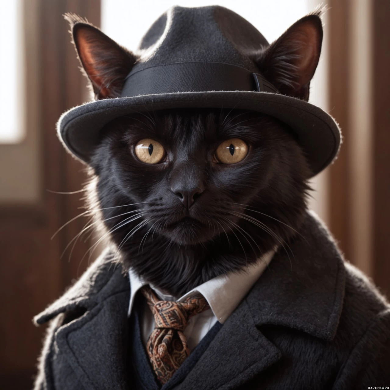 На картинке – чёрный кот, который с помощью цифровой обработки выглядит как человек в солнцезащитных очках, шляпе и костюме. Кот смотрит прямо в камеру с серьёзным выражением лица. У него зелёные глаза, что необычно для кошек.