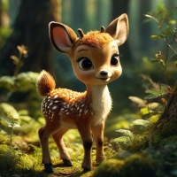 На картинке – цифровая визуализация оленёнка с заметными белыми пятнышками и большими карими глазами, стоящего на тропинке, окружённой деревьями с зелёной листвой. Солнечные лучи пробиваются сквозь листву, создавая игру света и тени, которая подчёркивает шерсть и выделяет черты оленёнка. Он выглядит настороженным и внимательным к происходящему. На заднем плане виднеется лесная подстилка, усыпанная мхом и опавшими листьями.