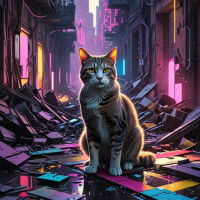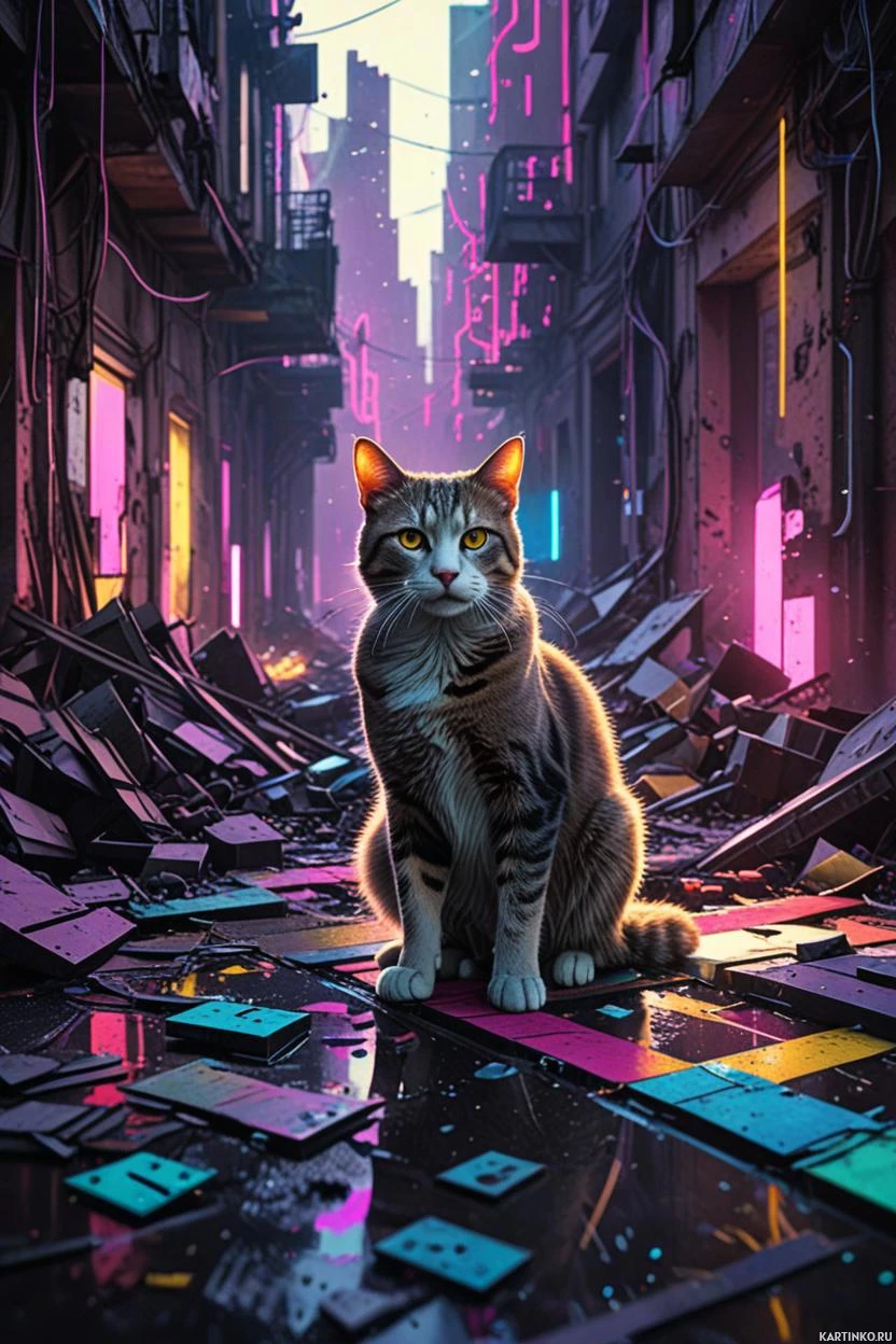 На картинке кот сидит в разрушенном городском переулке, заваленном обломками и мусором. У кота сосредоточенный взгляд, он смотрит немного в сторону от зрителя. На заднем плане едва различимы неоновые огни, что говорит о ночной сцене или месте, освещенном приглушенным светом. Цвета преимущественно холодные – преобладают оттенки фиолетового, синего и зеленого.