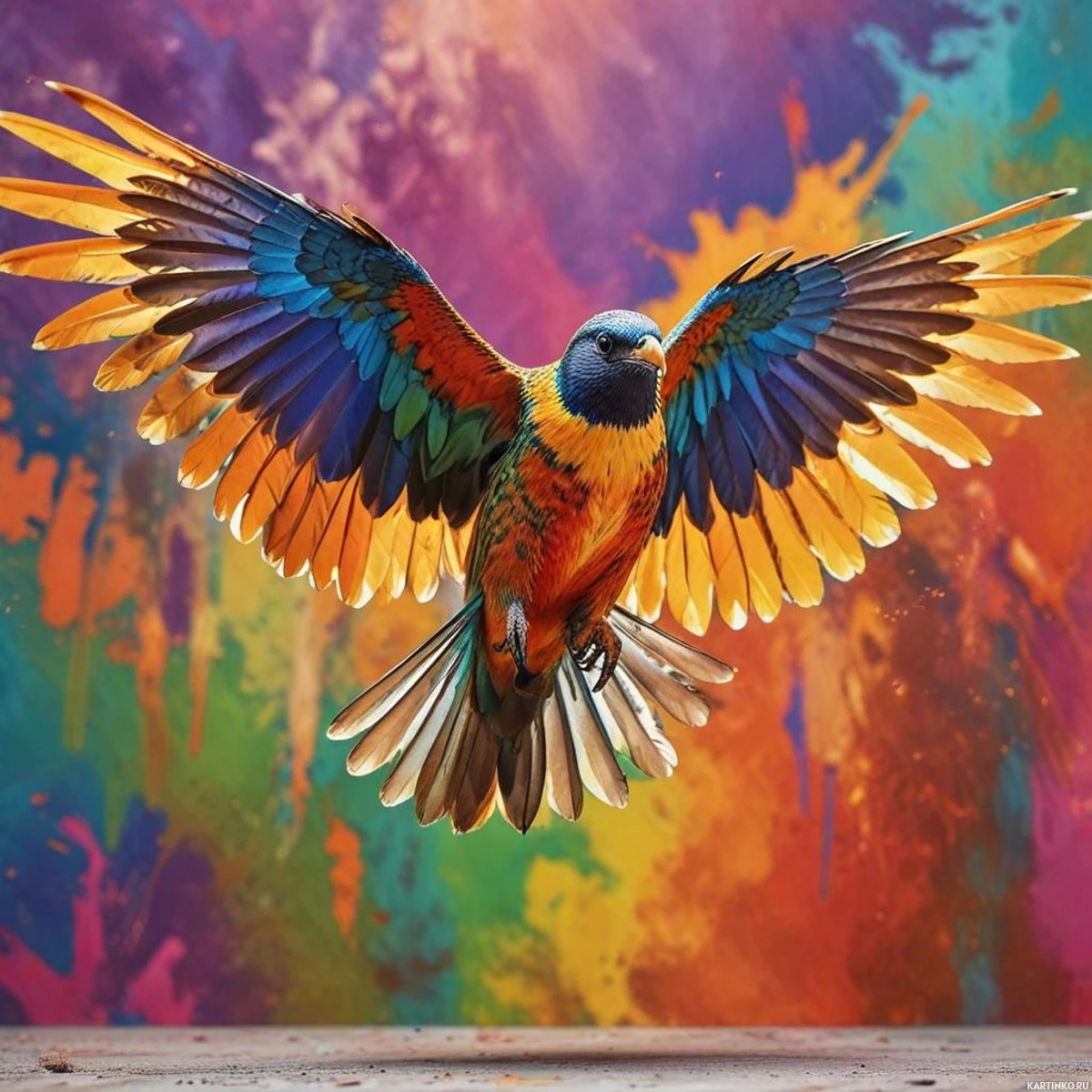 The image features a colorful parrot in flight with its wings fully spread. The bird has vibrant blue, yellow, green, and orange feathers. It is set against a background that appears to be painted or designed to resemble splashed paint with hues of purple, orange, red, and yellow blending together.