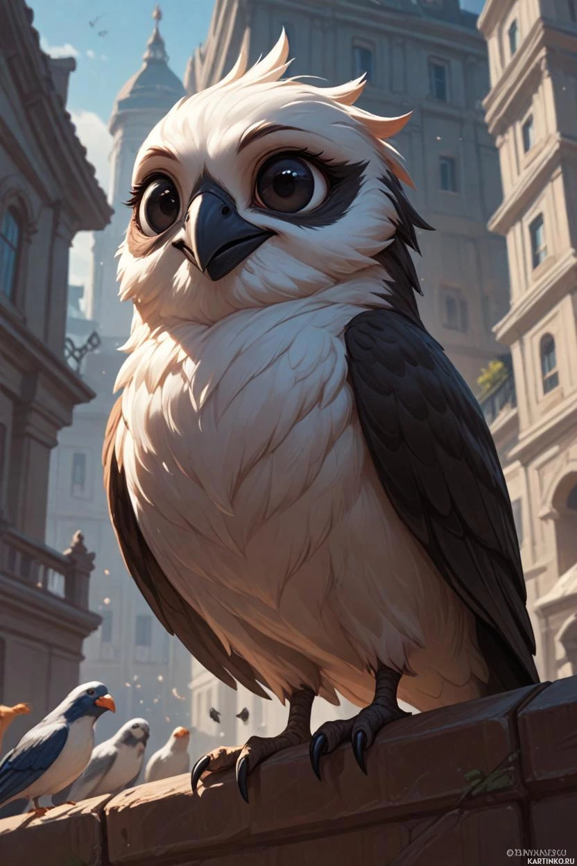 На картинке изображена мультяшная сова, стоящая на кирпичной стене на городской улице. На заднем плане видны здания и люди. Сова находится в центре, обращена к зрителю, у неё детализированное оперение коричневых, белых и чёрных оттенков. Она стоит на одной лапе, что придает ей настороженный вид. Справа от совы, на каменном выступе, сидит маленькая синяя птичка с оранжевым клювом. На заднем плане виден небо, что указывает на время дня, когда светит солнце, и освещает сцену мягким светом.