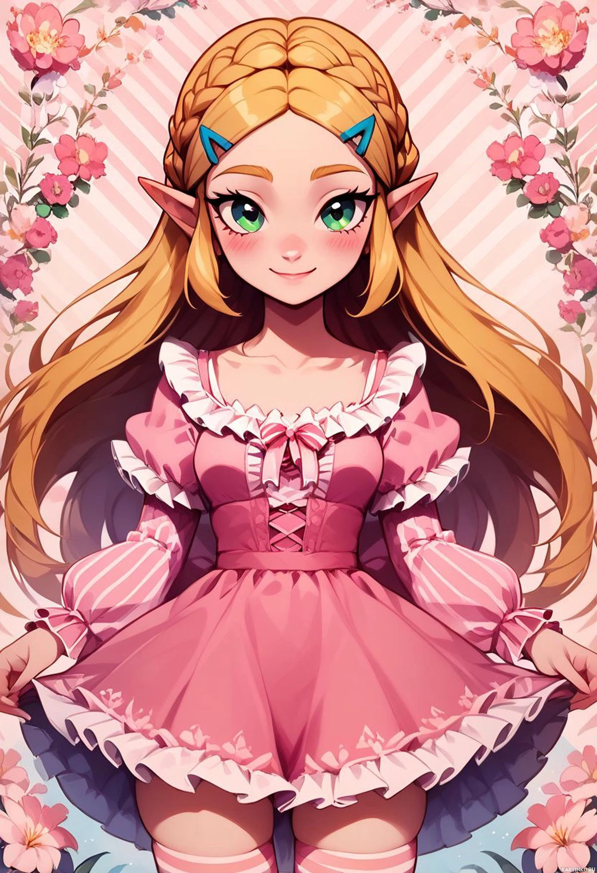 a pink dress with lace details at the collar, which gives the impression of a delicate and feminine design. The background consists of soft