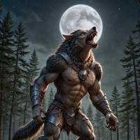 На картинке изображена фантастическая сцена с оборотнем. Оборотень стоит на переднем плане, выглядит свирепым и мускулистым, с заметными клыками, большими ушами и шерстью, сливающейся с темнотой ночи. Его поза говорит об агрессии или боевой готовности. На заднем плане виден полный месяц, освещающий жутковатым светом пейзаж. Действие происходит в густом лесу под лунным светом, на фоне возвышаются высокие деревья.