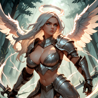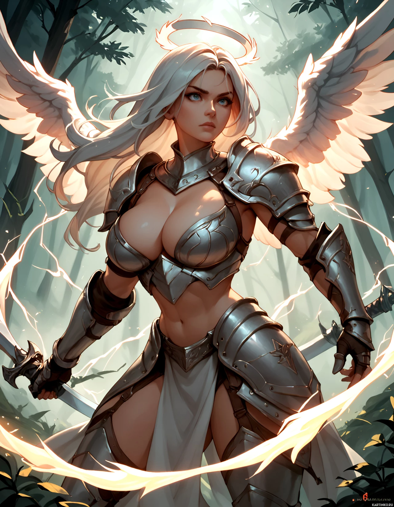 In the image, I see a fantasy-themed illustration featuring an angelic figure. The character has white hair and is depicted with large wings on her back. She is wearing armor that includes a breastplate and pauldrons, suggesting a warrior or protector archetype within the context of this artwork. In one hand, she holds a sword, while in the other, she wields a staff topped with a glowing orb. The background suggests a mystical forest setting with twisted roots and a sense of enchantment.