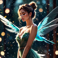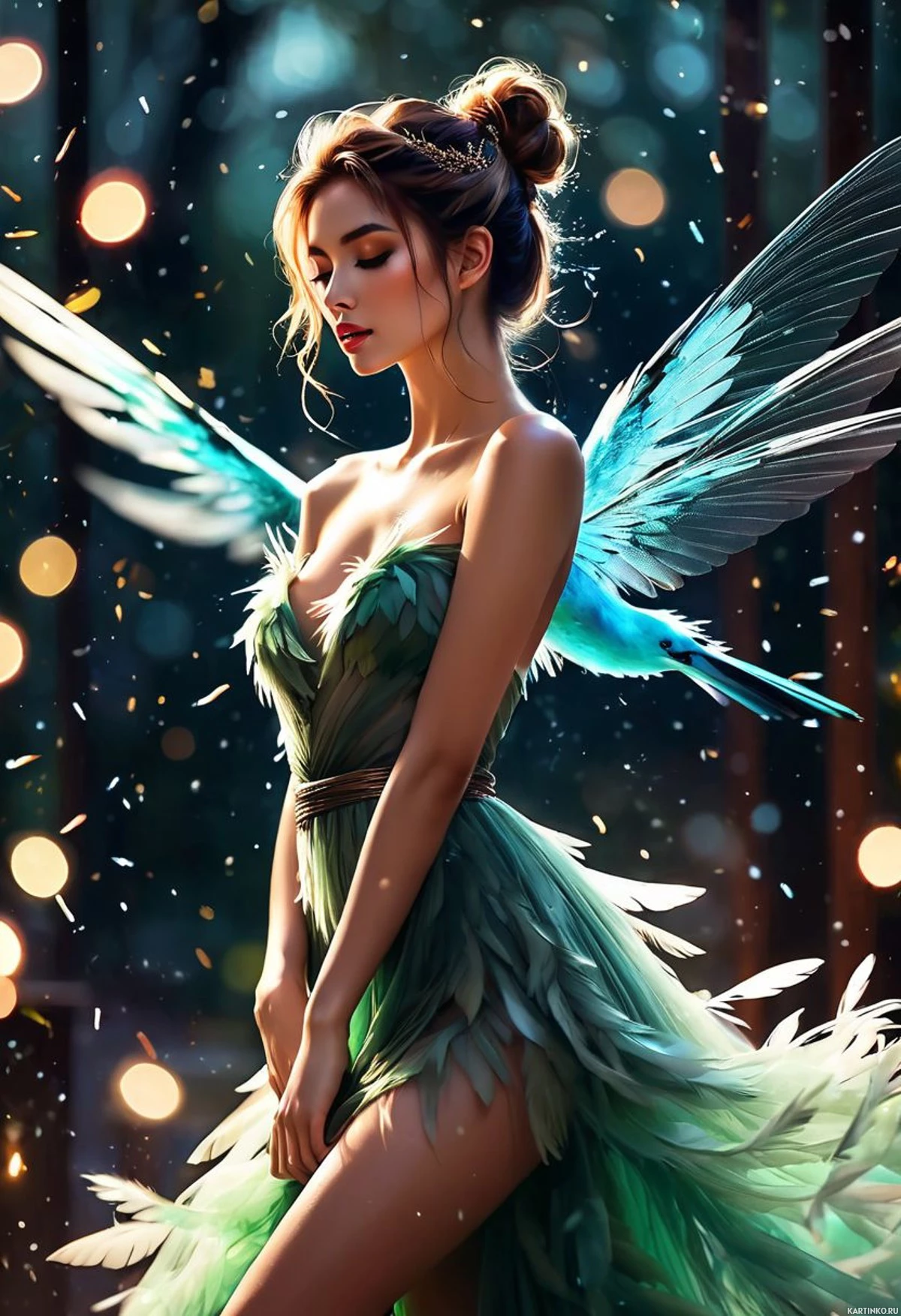 closed eyes, giving her an angelic appearance. She has large feathered wings and is adorned in a long