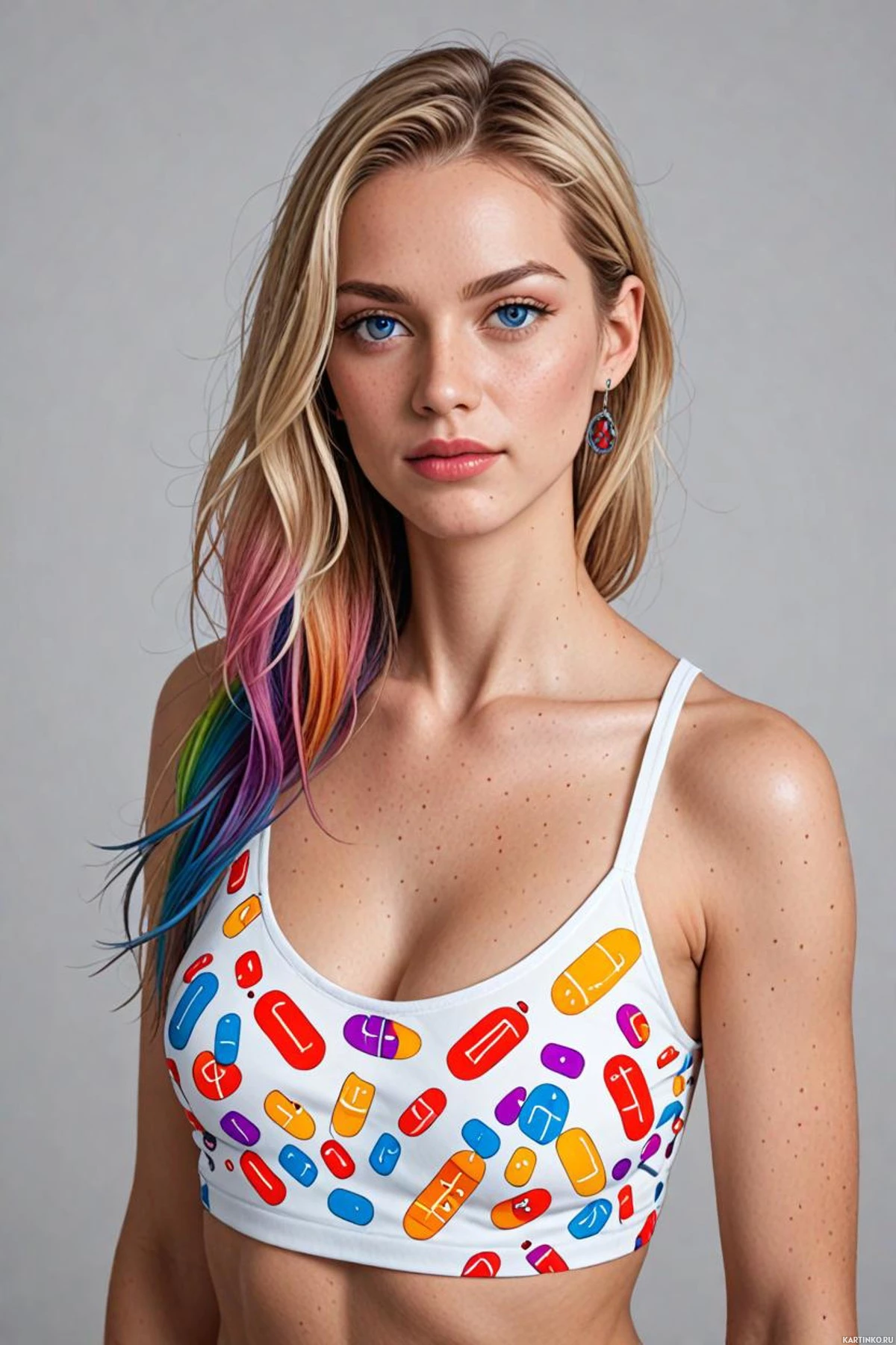 The image features a woman posing for the camera. She has long blonde hair and multicolored streaks in her hair, particularly noticeable on the underside of her long bangs. Her makeup is natural with subtle contouring around her eyes and cheeks. She wears an off-the-shoulder top with a graphic design that resembles candy pieces in various colors such as pink, blue, yellow, and white. The lighting of the photograph highlights her features and gives it a clean, professional look.
