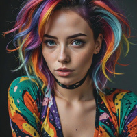 The image features a person with vibrant, multicolored hair that appears to be styled in an edgy fashion. They have a neutral expression on their face and are looking directly at the camera. The individual is wearing makeup, which includes prominent pink lipstick, complementing their colorful hair. Their eyebrows are shaped neatly, adding to their well-groomed appearance. The person is dressed in a top that has a colorful and patterned design, featuring hues of blue, green, yellow, and orange. The garment is cut off at the shoulders, allowing the hair to be a central focus in the composition. The lighting is soft and evenly distributed, casting gentle shadows on their face and adding depth to the photograph. The overall style of the image suggests it might be used for promotional purposes, possibly related to fashion, makeup artistry, or modeling due to the stylized hair and makeup, as well as the vivid clothing choices.