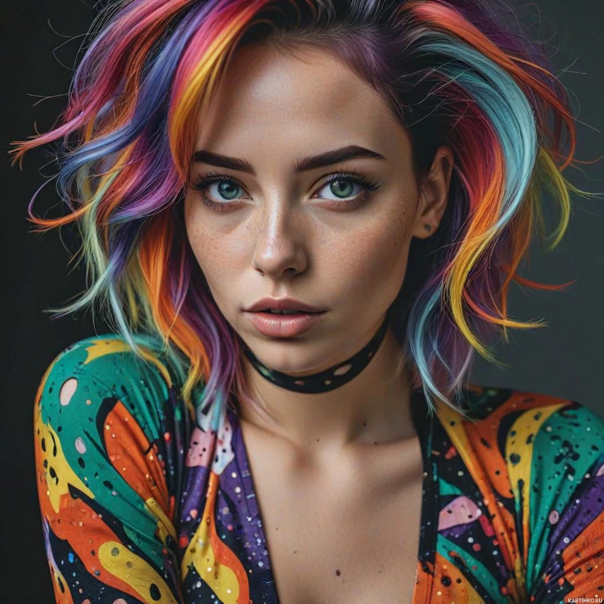 На картинке запечатлён человек с яркими, разноцветными волосами, уложенными в дерзный стиль. На лице спокойное выражение, взгляд направлен прямо в камеру. На лице макияж, в том числе заметная розовая помада, которая гармонирует с цветными волосами. Брови аккуратно оформлены, что добавляет ухоженности внешнему виду. Человек одет в топ с красочным, узорчатым дизайном, сочетающим оттенки синего, зелёного, жёлтого и оранжевого. Верхняя часть одежды обрезана на уровне плеч, чтобы волосы стали центральным элементом композиции. Освещение мягкое и равномерное, создающее лёгкие тени на лице и придающее фотографии глубину. Общий стиль картинки предполагает, что она может использоваться в рекламных целях, возможно, связанных с модой, макияжем или моделингом, благодаря стильной причёске и макияжу, а также насыщенному выбору одежды.