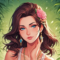 На картинке представлен очень детализированный рисунок женского персонажа. У неё длинные волнистые волосы, голубые глаза с золотистыми отблесками и светлая кожа. Выражение лица нейтральное, с лёгкой грустью или задумчивостью. Персонаж украшена различными аксессуарами, такими как цветочный венок на голове, где особенно выделяется розовый цветок. На одном ухе у неё крупное украшение, а также несколько ювелирных изделий, включая браслеты, нарукавник, ожерелье и, возможно, кольцо или ещё одно украшение на шее. Одежда включает топ без рукавов розоватого оттенка, напоминающий классические драпировки, в сочетании с юбкой или накидкой, изящно ниспадающей на одно плечо. На одежде – замысловатые узоры и, кажется, золотые акценты, придающие ей роскошный вид. Фон размыт, но просматриваются очертания деревьев и листьев, что указывает на природную обстановку, возможно, весеннюю или летнюю, благодаря наличию цветов. Цветовая палитра доминирует пастельными тонами, с преобладанием тёплых золотых, розовых и белых оттенков. Общий стиль иллюстрации напоминает искусство высокого фэнтези, характеризующееся вниманием к деталям и передающей неземную атмосферу.