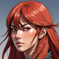 The image shows a digital artwork of a female character with red hair. She has a serious expression on her face, and she appears to be wearing some sort of armor or clothing that suggests a role of readiness for action or battle. The background is plain, allowing the focus to remain on the character. The image is styled in a realistic manner with attention to detail in the textures and shading to give a lifelike appearance.