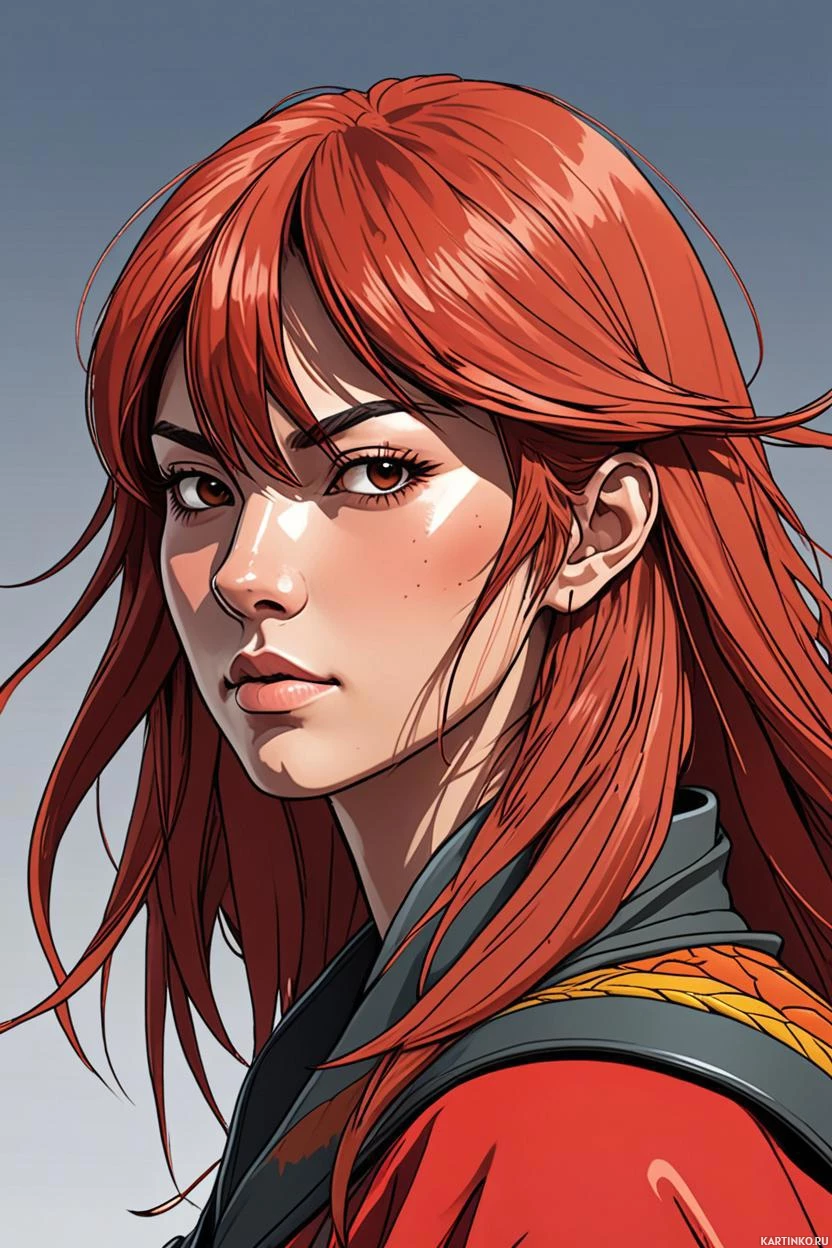 На картинке – цифровая иллюстрация девушки с рыжими волосами. У неё серьёзное выражение лица, и по одежде, напоминающей доспехи, видно, что она готова к действию или бою. Фон нейтральный, чтобы не отвлекал от героини. Стиль изображения – реалистичный, с вниманием к деталям текстур и теней, что создает ощущение жизненности.
