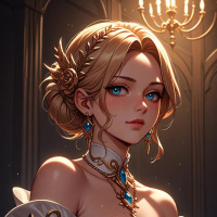 This image features a three-dimensional model of a female character with blonde hair and blue eyes, depicted in a stylized artistic manner. The character is wearing intricate fantasy armor and accessories, including what appears to be a choker or necklace with a gemstone and possibly a tiara or crown on her head. She has a serene expression and a soft lighting that highlights her features gently.