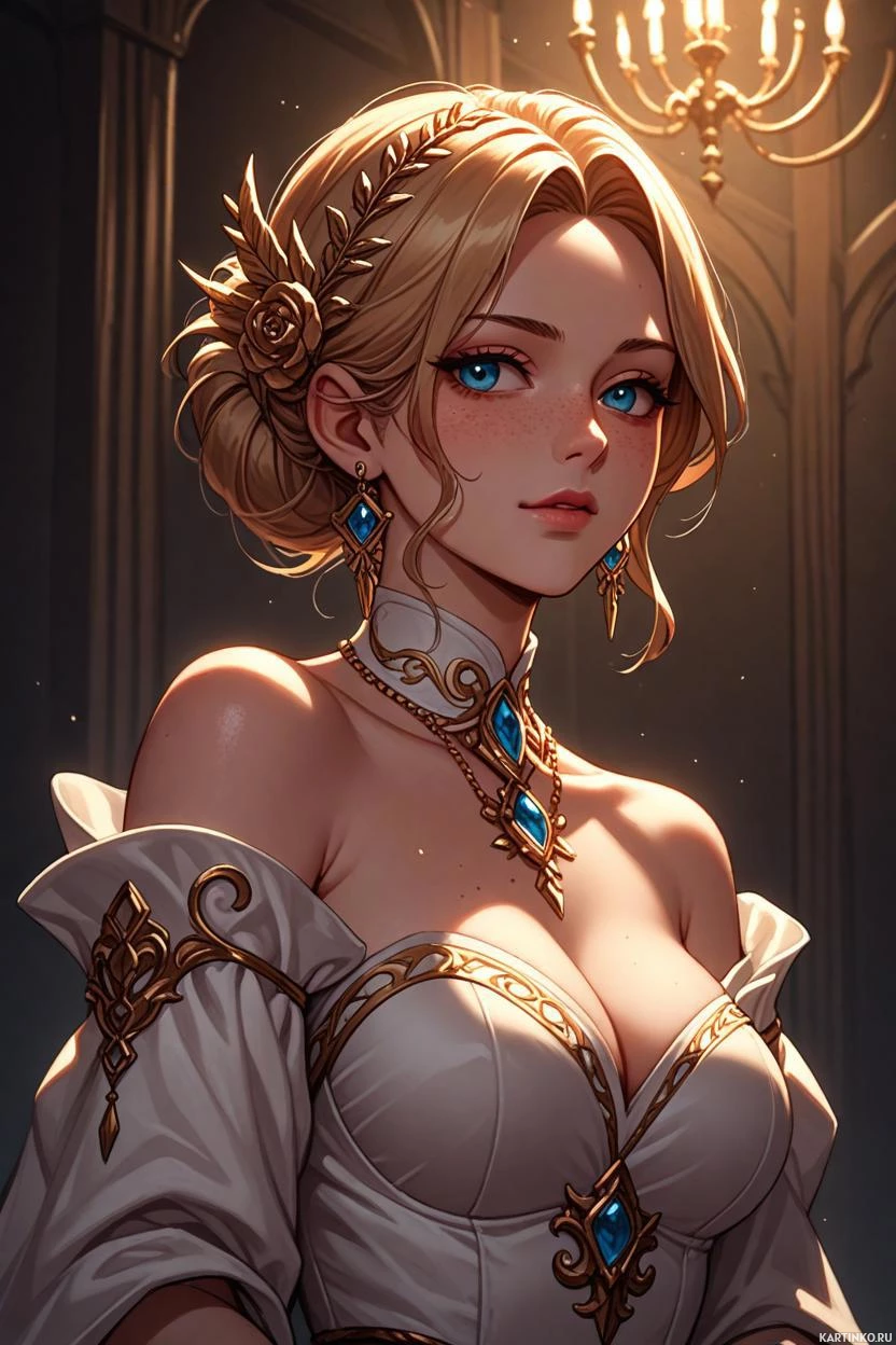 На картинке представлена трехмерная модель женского персонажа с золотистыми волосами и голубыми глазами, выполненная в стилизованной художественной манере. На персонаже сложный фэнтезийный доспех и аксессуары, в том числе, похоже, чокер или колье с драгоценным камнем, а также, возможно, тиара или корона на голове. У неё спокойное выражение лица и мягкое освещение, нежно подчёркивающее её черты.