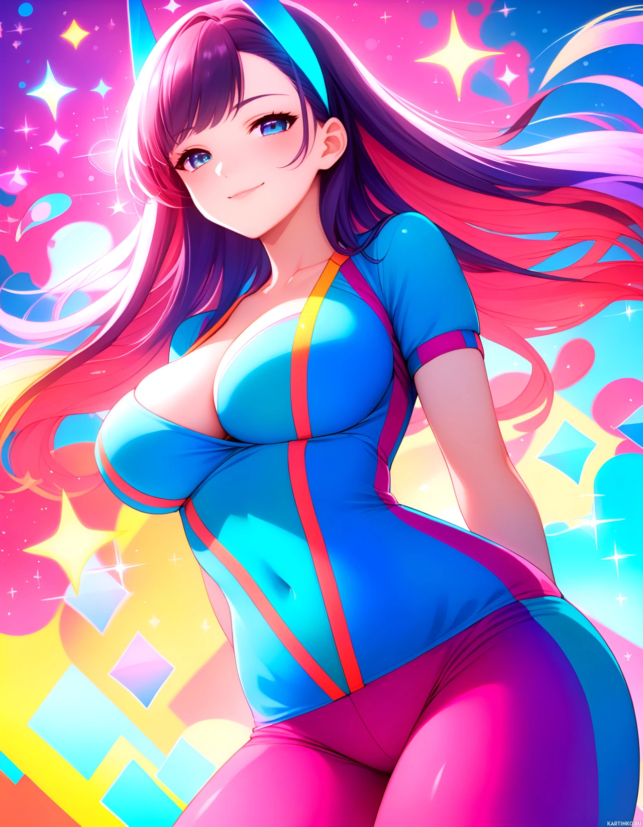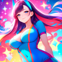 The image features a stylized illustration of a female character. She has large blue eyes and a cheerful expression, with pink lipstick visible on her lips. Her hair is long and wavy, with shades of purple that match her skin tone. The character is wearing a tight-fitting blue bodysuit with red accents and a matching headpiece that resembles a pair of cat ears. The background has a fantastical space theme, with vibrant colors including pink, yellow, and green, creating an energetic atmosphere. There are also small stars scattered across the background. The overall style is reminiscent of anime or manga illustrations, known for their vivid color palettes and expressive character designs.