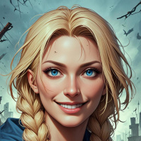 The image features a woman with blonde hair tied in braids. She has blue eyes and is smiling at the viewer. She appears to be wearing some kind of costume or outfit that suggests an adventurous or heroic character, as indicated by the straps and buckles visible on her shoulders and chest. The background is dark with hints of destruction or chaos, which may imply a setting related to action or conflict. The style of the image is reminiscent of modern digital artwork commonly associated with video game characters or comic book illustrations.