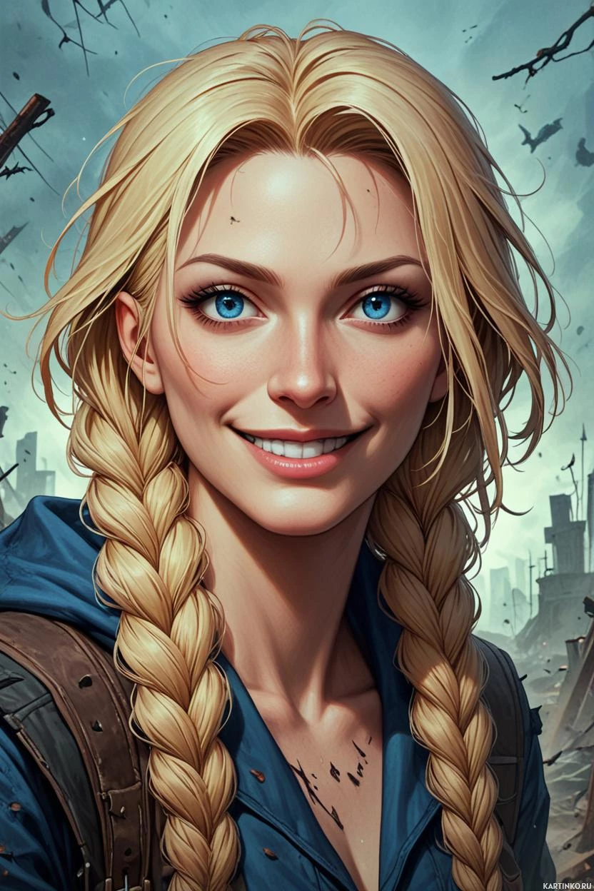 На картинке изображена женщина с золотистыми косами. У неё голубые глаза и она улыбается. На ней, похоже, костюм, намекающий на отважный или героический персонаж – об этом говорят лямки и пряжки на плечах и груди. Фон тёмный, с намёками на разрушения или хаос, что может указывать на место действия, связанное с действием или конфликтом. Стиль картинки напоминает современную цифровую графику, характерную для персонажей видеоигр или иллюстраций из комиксов.