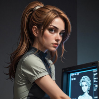 The image depicts a person posed in front of a backdrop that resembles a futuristic setting, possibly a computer interface given the presence of what appears to be a screen or monitor. The individual is wearing an outfit that could be interpreted as a form-fitting jumpsuit with a high collar and what seems to be a belt cinching it at the waist. The sleeves are rolled up, revealing the person's arms, which suggests a casual yet stylish attire. Their hair is pulled back and they have a neutral expression on their face. The lighting is focused, highlighting the contours of the outfit and creating a sense of depth in the image. The background has subtle gradient shades that transition from warm to cooler tones, which adds to the sci-fi or cyberpunk aesthetic. Please note that as an AI, I am not able to provide personal contact information.