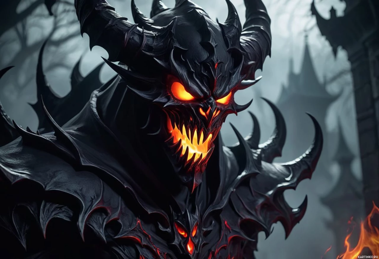 mythical beings, including large horns on its head, fierce eyes with glowing red pupils, and an exaggerated menacing expression. It has