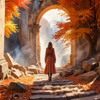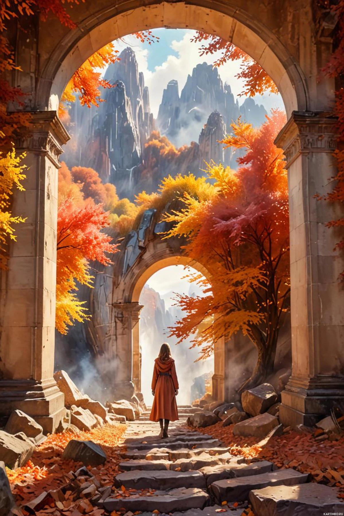 На картинке девушка идет по осеннему пейзажу. Она появляется из-за угла и запечатлена в движении, по тропинке, пролегающей между двумя каменными колоннами. Тропинка ведет к величественной горной цепи вдалеке, увенчанной снегом. По сезонным признакам видно, что это осень: деревья, обрамляющие тропу, окрасились в яркие оттенки оранжевого и красного. Трава вокруг тропинки усыпана опавшими листьями, что еще больше подчеркивает осенний колорит. Общая атмосфера картинки передает ощущение мирной, уединенной тишины – девушка кажется одинокой в своем путешествии по этому живописному осеннему пейзажу.