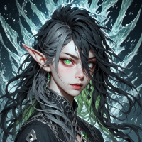 In this image, I see a character depicted in a fantasy-themed illustration. The character has long black hair with some green tones at the bottom. She has pointed ears, which are a common trait associated with elves in fantasy genres. Her eyes have an unusual glow that could be interpreted as magical or supernatural. The character is wearing intricate armor and a clothing style reminiscent of medieval fantasy, featuring lace-up details and what appears to be a choker-style neckpiece with jewels or stones embedded in it. The overall color palette is dark, with blacks and greens dominating the tones, which contributes to an atmosphere that suggests mystery or otherworldliness. The background of the image has a starry sky or celestial motif, with dark, twisting shapes that could be interpreted as clouds or nebulous formations, reinforcing the fantasy theme. The character's expression is neutral yet intense, and she seems to be looking directly at the viewer.
