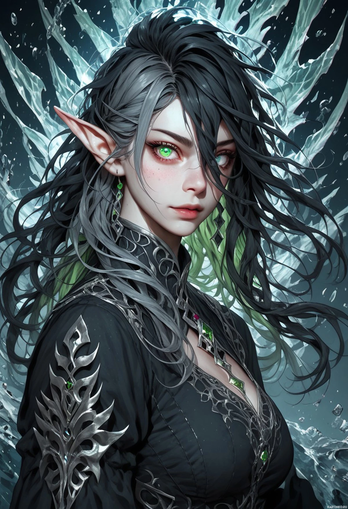 На этой картинке изображен персонаж в иллюстрации в стиле фэнтези. У нее длинные черные волосы с зеленоватыми прядями у основания. У нее заостренные уши – характерная черта эльфов в фэнтезийных произведениях. Ее глаза светятся необычным светом, что может быть интерпретировано как магическое или сверхъестественное явление. Персонаж одета в сложный доспех и одежду, напоминающую средневековое фэнтези, с шнуровкой и, похоже, ожерельем с драгоценными камнями или камнями. Цветовая палитра в целом темная, преобладают черный и зеленый, что создает атмосферу таинственности или потусторонности. На заднем плане – звездное небо или небесный мотив, с темными, извилистыми формами, которые можно принять за облака или туманные образования, что усиливает фэнтезийную тематику. Выражение лица персонажа нейтральное, но напряженное, и она смотрит прямо на зрителя.