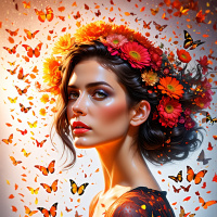 The image portrays a woman with long brunette hair. She has fair skin and is wearing makeup that enhances her features, particularly around the eyes. Her gaze is directed to the left side of the frame, conveying a sense of contemplation or focus on something out of view. She is adorned with what appears to be a crown-like arrangement made up of vibrant flowers and leaves in shades of orange, yellow, and green, which suggests an autumnal theme. The floral arrangement is intricately designed, with some flowers appearing to be larger and more prominent than others. Around her head, there are butterflies captured mid-flight, their wings displaying a variety of colors that complement the overall color palette of the image. Some butterflies are positioned closer to her face, while others are spread around her head and shoulders. The background is a gradient of dark to light gray, which helps the subject stand out without being overly contrasting. The entire composition gives off an ethereal or mystical vibe due to the combination of the autumnal floral crown and the presence of butterflies, elements often associated with transformation or spirituality in various cultural symbolism.