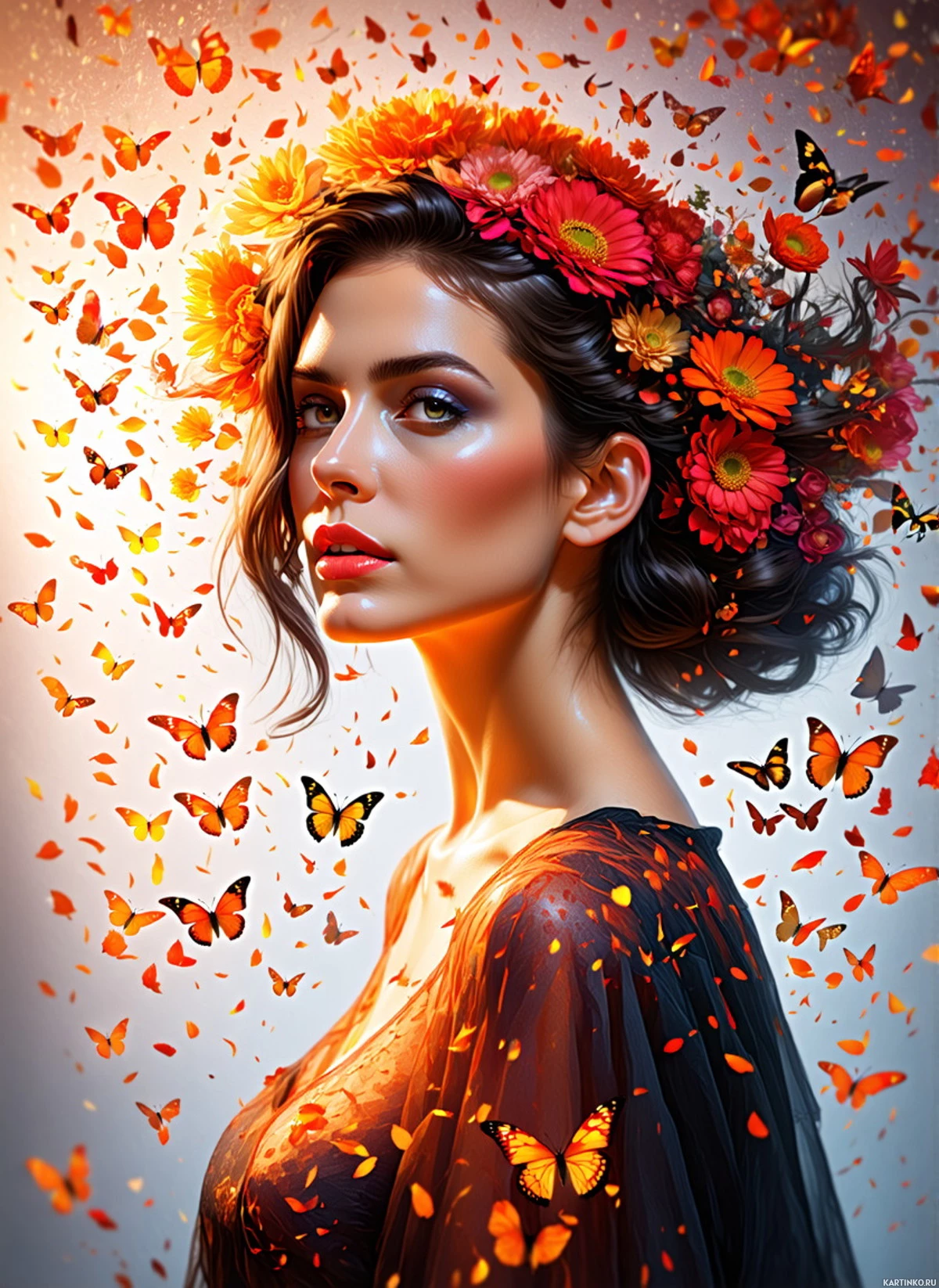 На картинке изображена женщина с длинными каштановыми волосами. У нее светлая кожа и макияж, подчеркивающий черты лица, особенно область вокруг глаз. Её взгляд направлен влево, создавая ощущение задумчивости или сосредоточенности на чём-то, что находится за кадром. На её голове – что-то похожее на венок, сплетенный из ярких цветов и листьев в оттенках оранжевого, желтого и зеленого, что создает осеннюю атмосферу. Венок выполнен очень изящно, некоторые цветы выглядят крупнее и заметнее других. Вокруг её головы запечатлены бабочки в полете, их крылья украшены множеством цветов, гармонирующих с общей цветовой гаммой картинки. Некоторые бабочки расположены ближе к её лицу, другие – разбросаны вокруг головы и плеч. Фон – градиент от темно-серого к светлому, который помогает выделить главную героиню, не создавая слишком резкого контраста. Вся композиция создает ощущение нежности и загадочности благодаря сочетанию осеннего цветочного венца и бабочек – элементов, часто ассоциирующихся с трансформацией или духовностью в различных культурных символах.