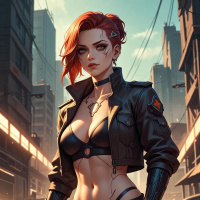 На картинке изображена девушка с рыжими волосами в футуристичном стиле. На ней обтягивающий черный кожаный костюм, плотно прилегающий к туловищу и более свободный на ногах. У неё пирсинг в ушах, чокер и, похоже, ожерелье или воротник с каким-то знаком или узором. Выражение лица нейтральное, с легкой напряженностью, взгляд направлен немного вверх. На заднем плане – указатели, намекающие на обстановку, напоминающую антиутопичный городской пейзаж, возможно, город, осажденный или постапокалиптический, судя по огню и разрушениям вдалеке.