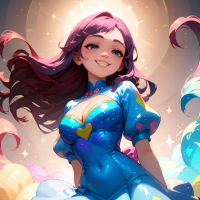 The image features a female character with purple hair. She has a smiling expression on her face, and she's wearing a blue outfit that appears to be armor of some sort, indicated by the presence of straps and buttons suggesting utility or battle readiness. The background is surreal with elements such as clouds and stars, adding a fantastical element to the overall scene.