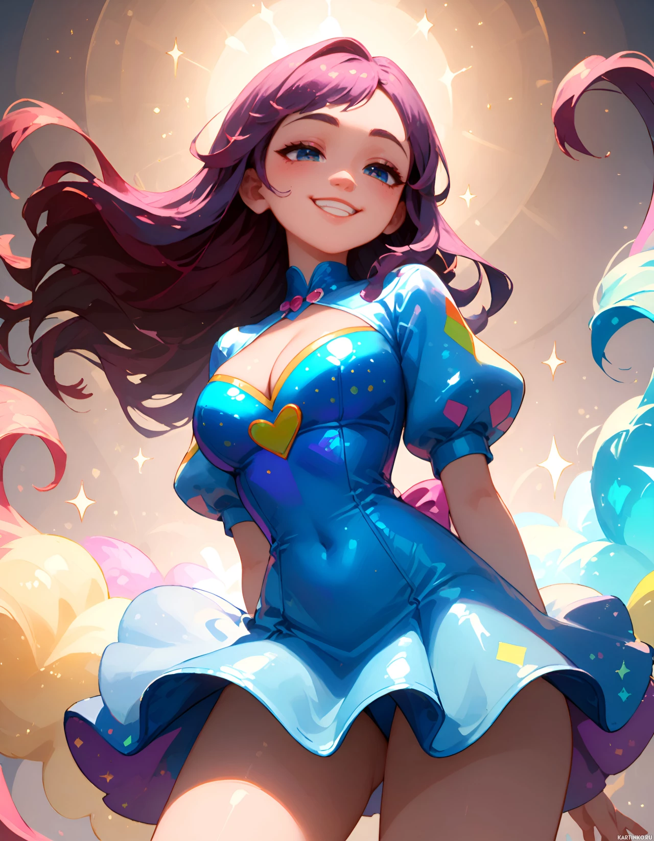На картинке изображена девушка с фиолетовыми волосами. На её лице улыбка, а на ней синий наряд, похожий на доспехи, с ремнями и пуговицами, намекающими на боевую готовность. Фон сюрреалистичен: облака и звёзды создают сказочную атмосферу.